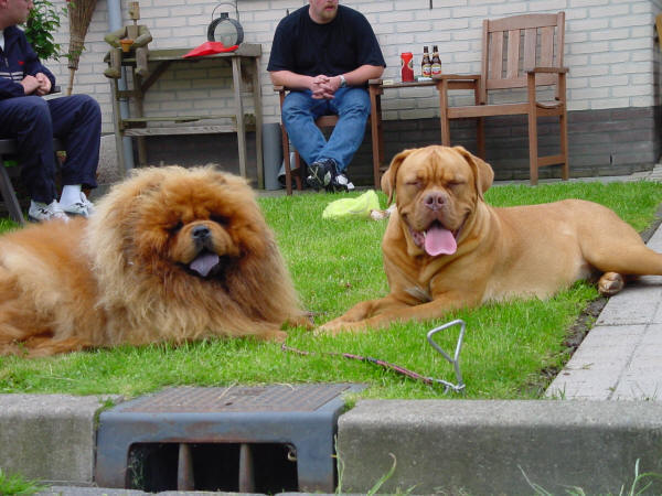Hier staat ze op de foto met Sjef. Sjef is een chow chow. Omdat Sjef niet gewend is om te spelen met andere honden weet hij niet altijd even goed hoe dat moet, en soms pakt hij heel venijnig een velletje van Sarge... Dat vind ze uiteraard niet zo leuk! Maar dan pakt ze hem wel weer terug door bovenop hem te gaan liggen...