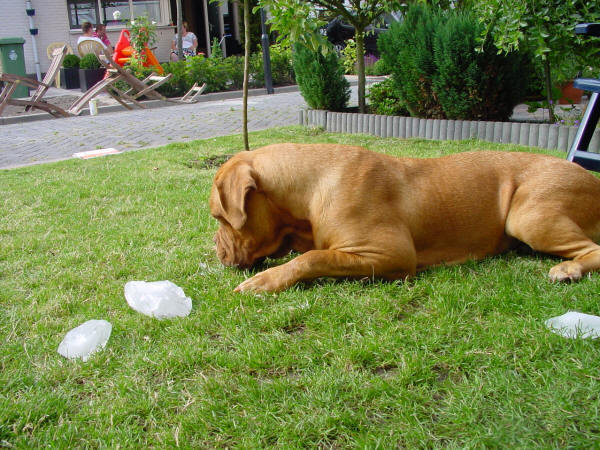 Het vrouwtje had een erg goed idee... Ze vond het zo warm deze dagen in juli, dat ze voor mij een "honden-ijsje" had gemaakt! Gewoon een paar bakken gevuld met water en ingevroren. Nou, dat vond ik helemaal te gek!