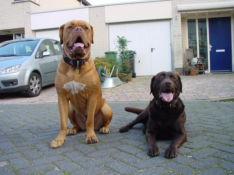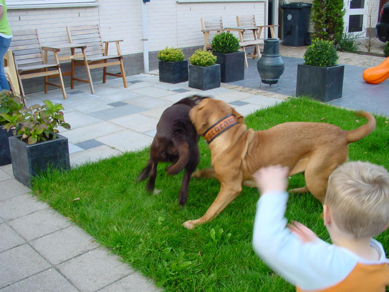 Als een grote wervelwind spelen hieronder dus Sarge en Happy! Als die elkaar tegenkomen dan moet je maken dat je uit de buurt komt, want die twee zien alleen elkaar nog maar, en voor je het weet word je ondersteboven geduwd door een kluwen hond die tegen je aan botst. Happy is een chocolade kleurige Labrador teefje.
