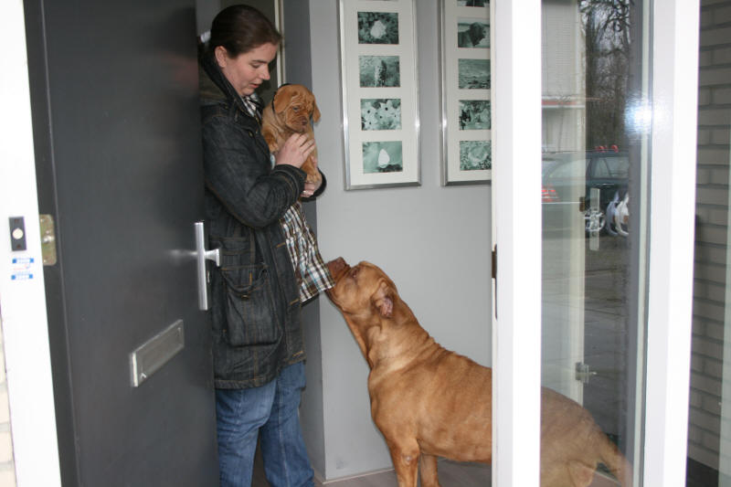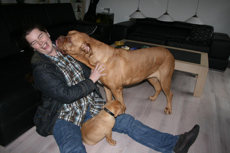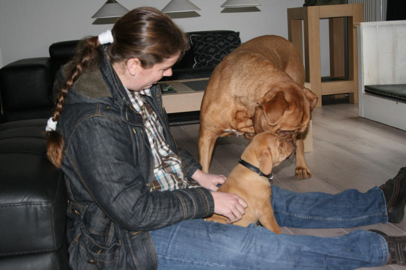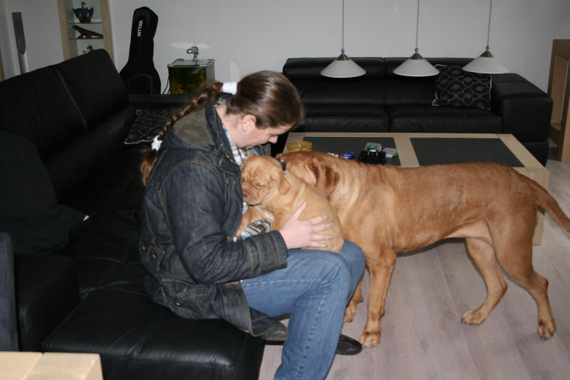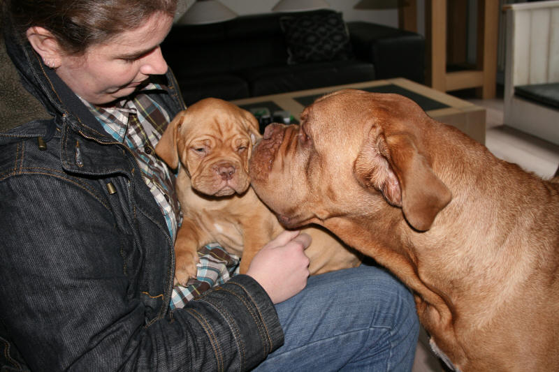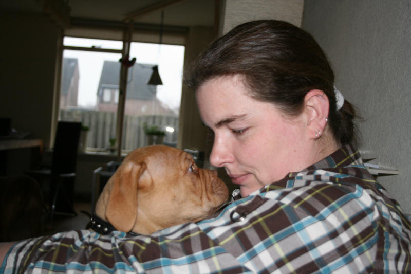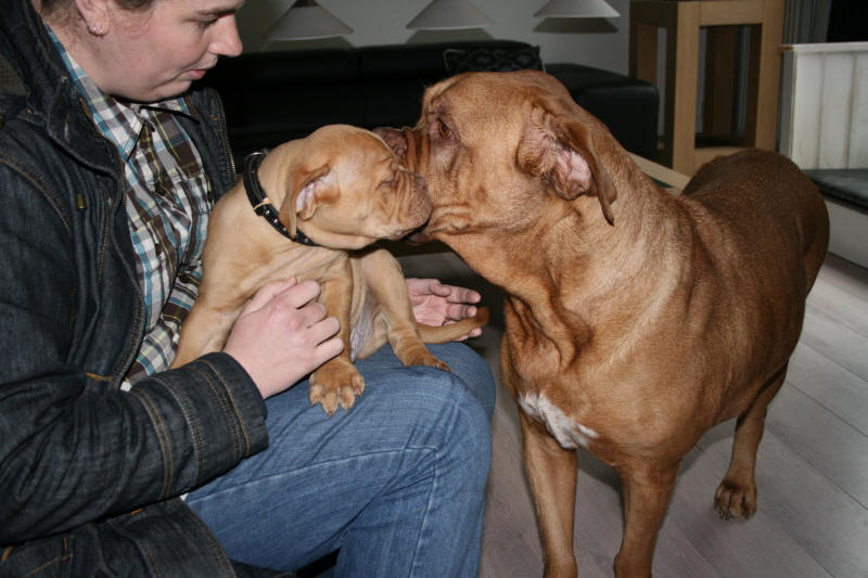 Sarge zegt hier tegen mijn nieuwe vrouwtje dat ze best blij is met mij als broer, wat mijn nieuwe vrouwtje krijgt ook veel kusjes!