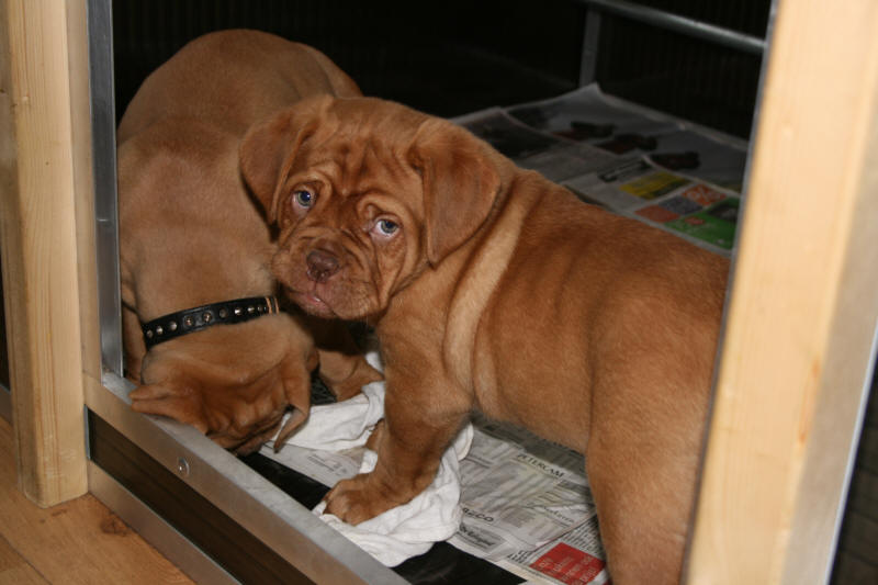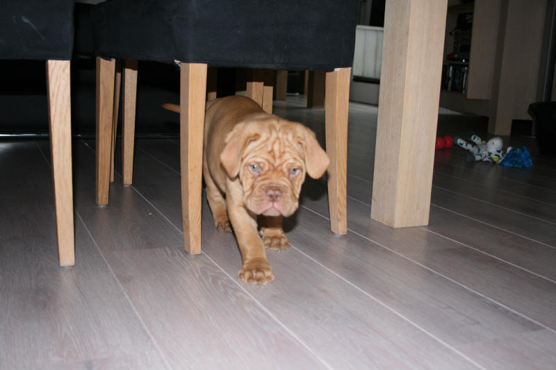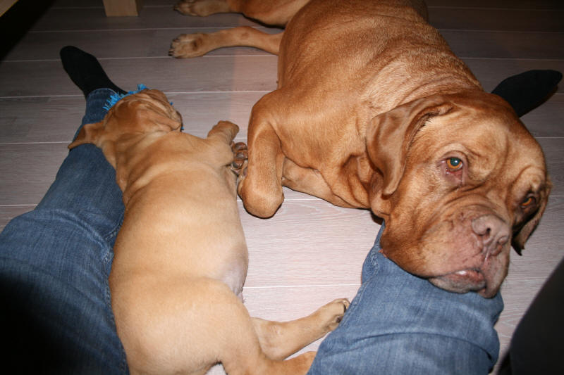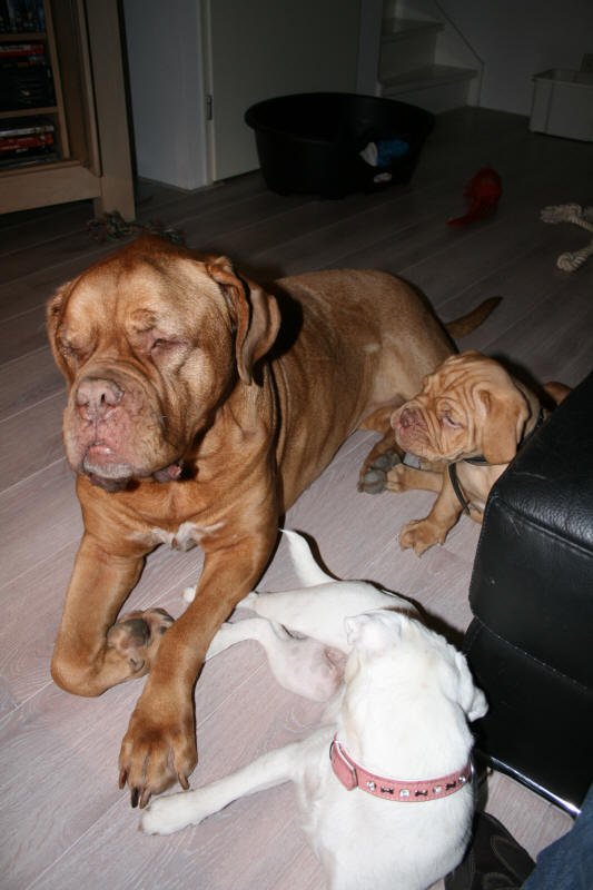 Vandaag zijn we naar Middenwaard geweest. Een overdekt winkelcentrum. Ik wil per dag twee dingetjes doen qua socialisatie, dus dit was zijn eerste uitstap om mee te beginnen. In Middenwaard is een koffiecorner die gewoon langs de looproute ligt, dus ben daar relaxed gaan zitten onder het genot van een bak koffie. Sarge ging zoals gewoonlijk lekker liggen, en ik denk echt dat het een hoop scheelt als je al een goede sociale volwassen hond hebt. Want ik zou zweren dat Vriend echt naar haar kijkt om te zien wat "zijn grote zus' van de situatie vind. Nou, Sarge dus languit, en Vriend dus lekker op zijn gat eens kijken wat al die mensen hier zoal doen. Hij kwam steeds losser en ging rustig rondsnuffelen wat er allemaal te doen is. Uiteraard heb je veel bekijks met volwassen Bordeaux doggen, maar met een pup is de commotie natuurlijk niet normaal! Vriend heeft zijn portie "vreemde mensen" wel gehad! Hahahha! En hij blijft er prima onder, zoals een dog betaamd. Helaas geen foto's dus, want kan gewoon niet echt wat extra's meeslepen met twee van deze lobbessen.