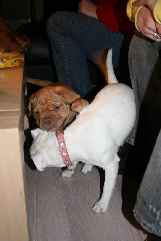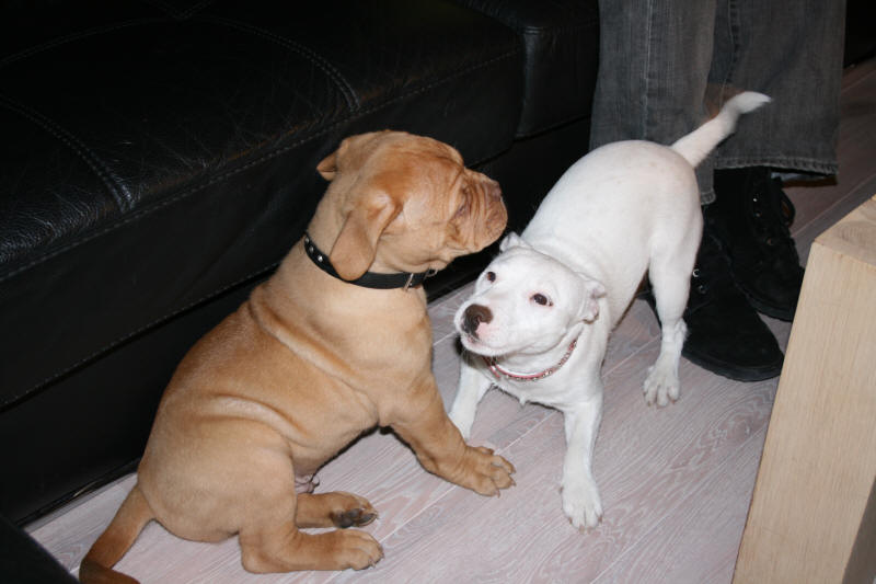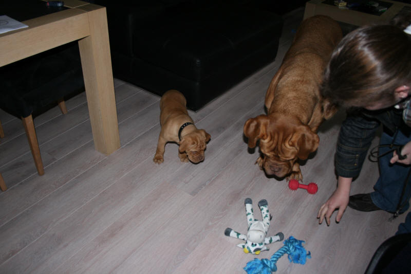 Zo! Socialisatie puntje twee vandaag! Mijn zusje Rose en haar vriend Danny kwamen op visite, en zij hadden Vriend zijn nichtjes Chance en Noa mee! Dolle prettttt!!!! Chance heeft een beetje een trauma opgelopen toen ze klein was, en daardoor is zij niet zo erg speels met andere honden, maar die NOA zeg! pfoe! wat hebben Vriend en Noa gespeeld! Ik had hem nog niet zo actief gezien! En ik krijg nog wat met hem te stellen, want die drol was nog behoorlijk op haar aan het rijden ook! Dat wordt nog wat.....