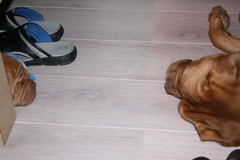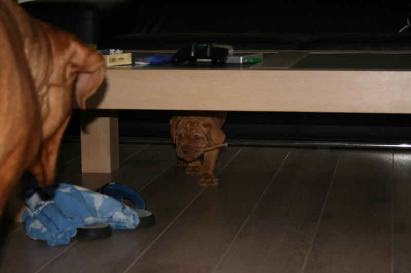 vandaag ook kennis gemaakt met DE STOFZUIGER! Nou echt, als dit zo blijft gaan dan heb ik echt een SUPERSTER in huis! Ik heb de stofzuiger eerst laten besnuffelen. Toen aan en uit gezet, op de laagste stand. dat een paar keer herhaald. Hij vond het vreemd natuurlijk, maar niet bang! Een beetje als een leeuw eromheen sluipen zeg maar. Hier komt Sarge weer even het voorbeeld geven. Sarge vind het heerlijk als ik haar stofzuig! gaat ze helemaal voor zitten! Dus ik met de stofzuiger op de laagste stand met klein zuigmondje Sarge afboenen. Nou, dat vond Vriend maar gek, dus ging dat tussen mijn benen maar even gadeslaan. En dan niet angstig tussen mijn benen hoor! gewoon net even wat "rugdekking", maar toch met scheef koppie naar die maffe Sarge kijken die dat maar toelaat, en zelfs van geniet! Nou, na zo'n vijf minuten en wat hoge geruststellende stemmetjes kon ik zelfs een paar halen over Vriend heen doen! Superrrrrr!! Ik vond het toen wel zelf welletjes, en ben gewoon gaan stofzuigen. En dat ging geweldig met Vriend.