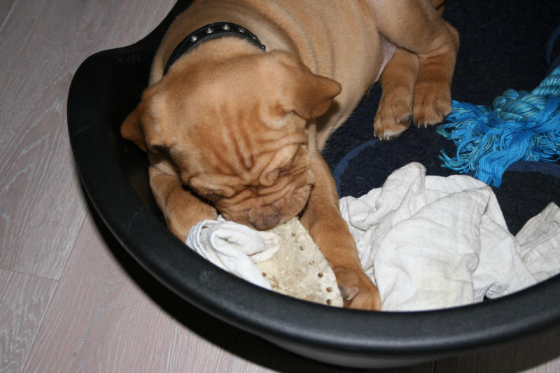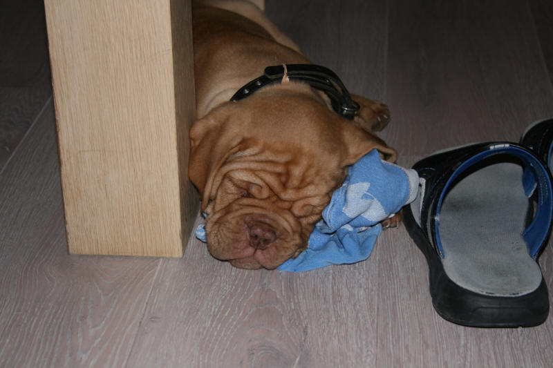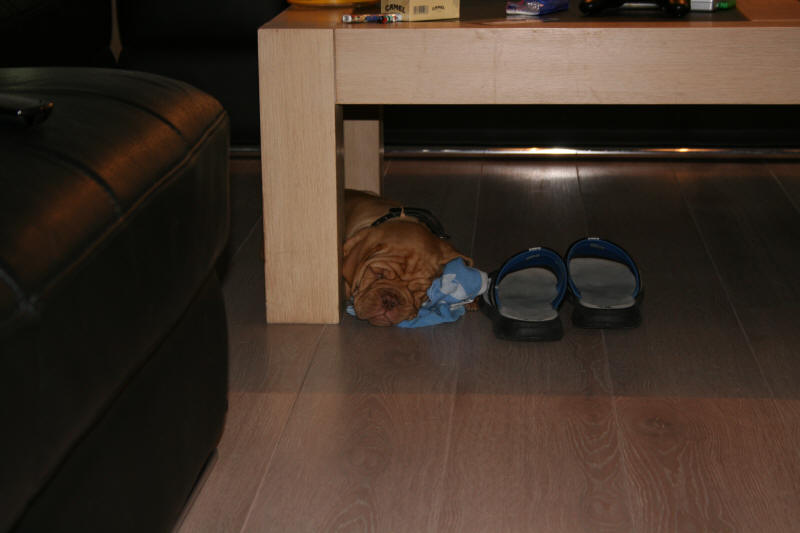 Naast de slippers, van iemand die mijn "baasje"gaat worden zegt vrouwtje, viel ik toen in slaap! Was ook zo'n lange dag...