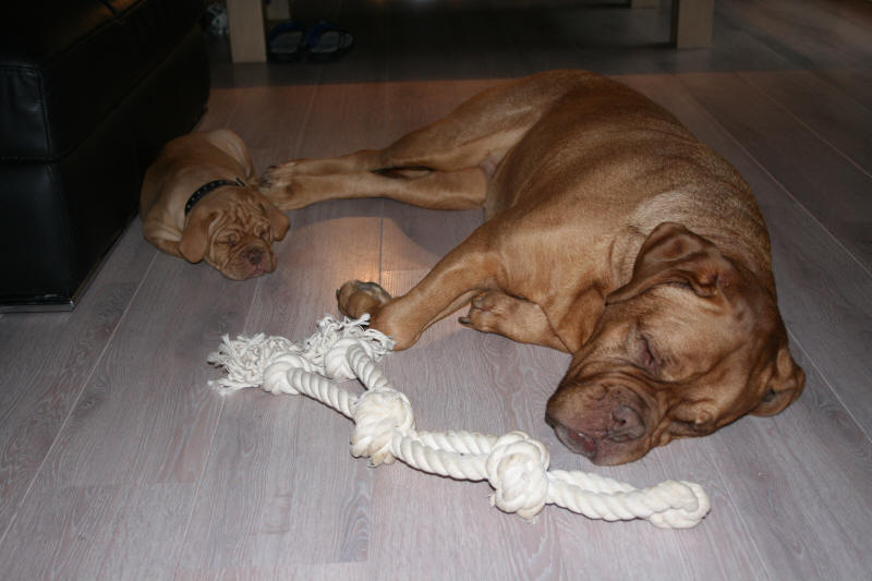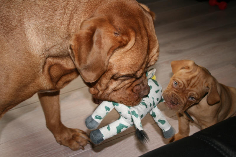 Verder is er vandaag een poging gedaan om samen te spelen. Sarge wil echt graag, maar durft niet zo goed met dat baby-spul. Dus telkens als Vriend met iets aan komt zetten dan kauwt Sarge er twee keer op en laat het vallen als Vriend eraan begint te sjorren. Ach, rustig aan, komt vanzelf wel goed tussen die twee als Vriend wat groter is!