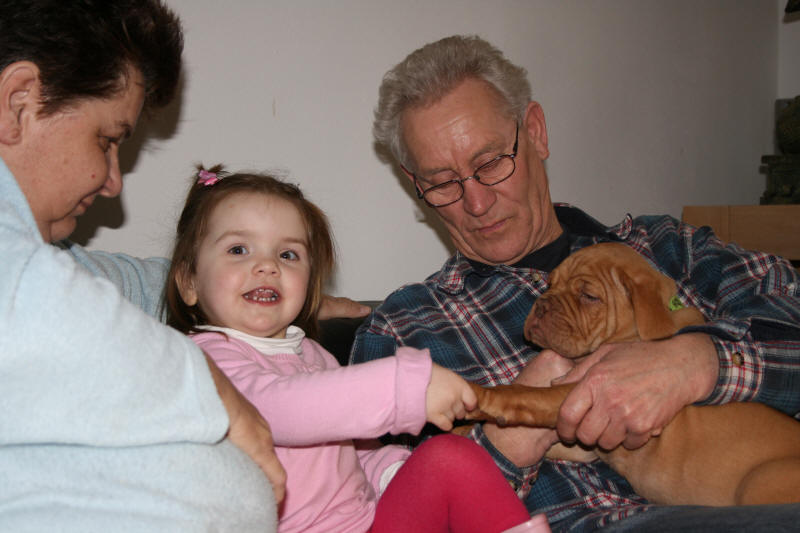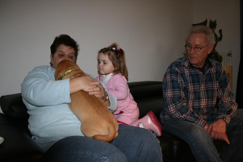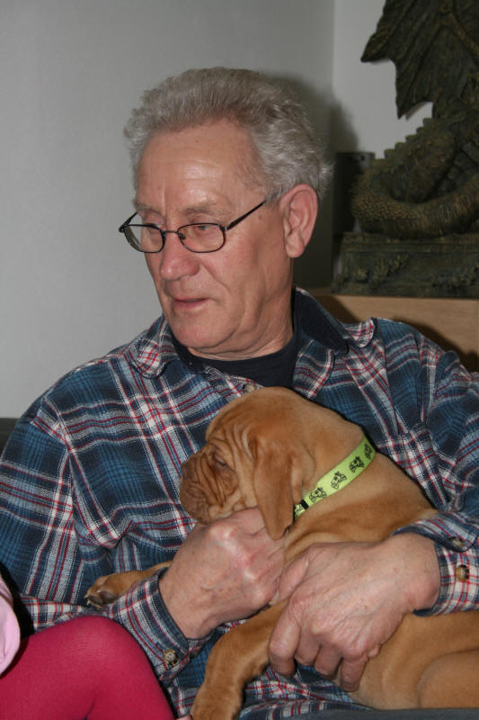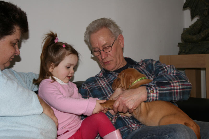 Opa natuurlijk ook even Vriend op schoot. Mijn vader is gek op dieren. En van huis uit hebben we dan ook altijd dieren gehad, en daar ben ik mijn ouders dan ook heel dankbaar voor. Zoals je ziet word dierenliefde ook een generatie verder aangeleerd, en geeft Jaymie hier een voorzichtige cursus "geef poot" aan Vriend.